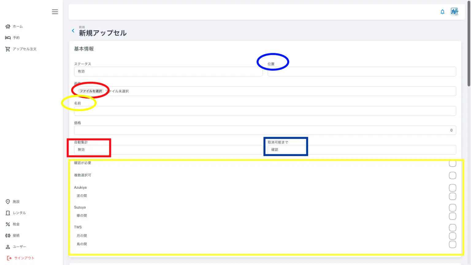 黄色四角印はチェックを付けていく部分です。確認を要せずに注文を受ける場合はチックを入れてください。ツアー販売など、施設側にも外注先への確認のためにワンクッション欲しい場合は、リクエスト販売が適切です。その場合は確認が必要にチェックを入れてください。逆に例えば、冷蔵庫内の飲料品のセルフ販売等には、チェックを外してください。