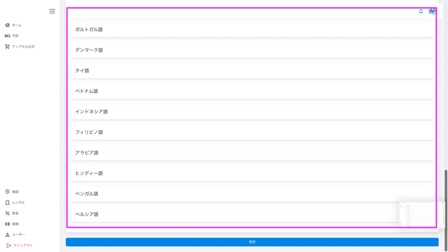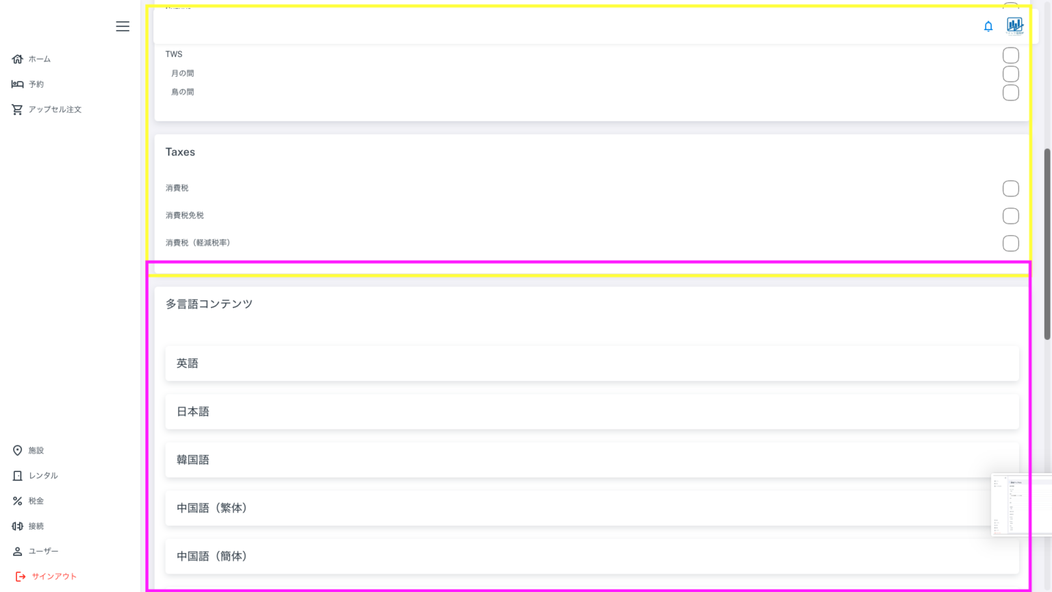 赤四角印でマークした「自動集計」は、オートコレクトすなわち自動決済のタイミングを設定します。クレジットカードの登録が宿帳上でされていることが前提です。アップセル(追加商品)の場合は、「無効」「確認」「提供」「到着時」「出発時」から選択することが可能です。宿泊税の設定の場合は「無効」「到着時」「出発時」からのみ選択が可能です。「確認」「提供」に関しては施設側が管理画面の「アップセル注文」でチェックボタンを押すと、自動で決済、集金します。