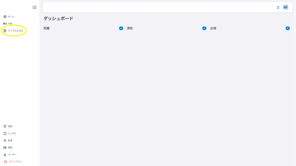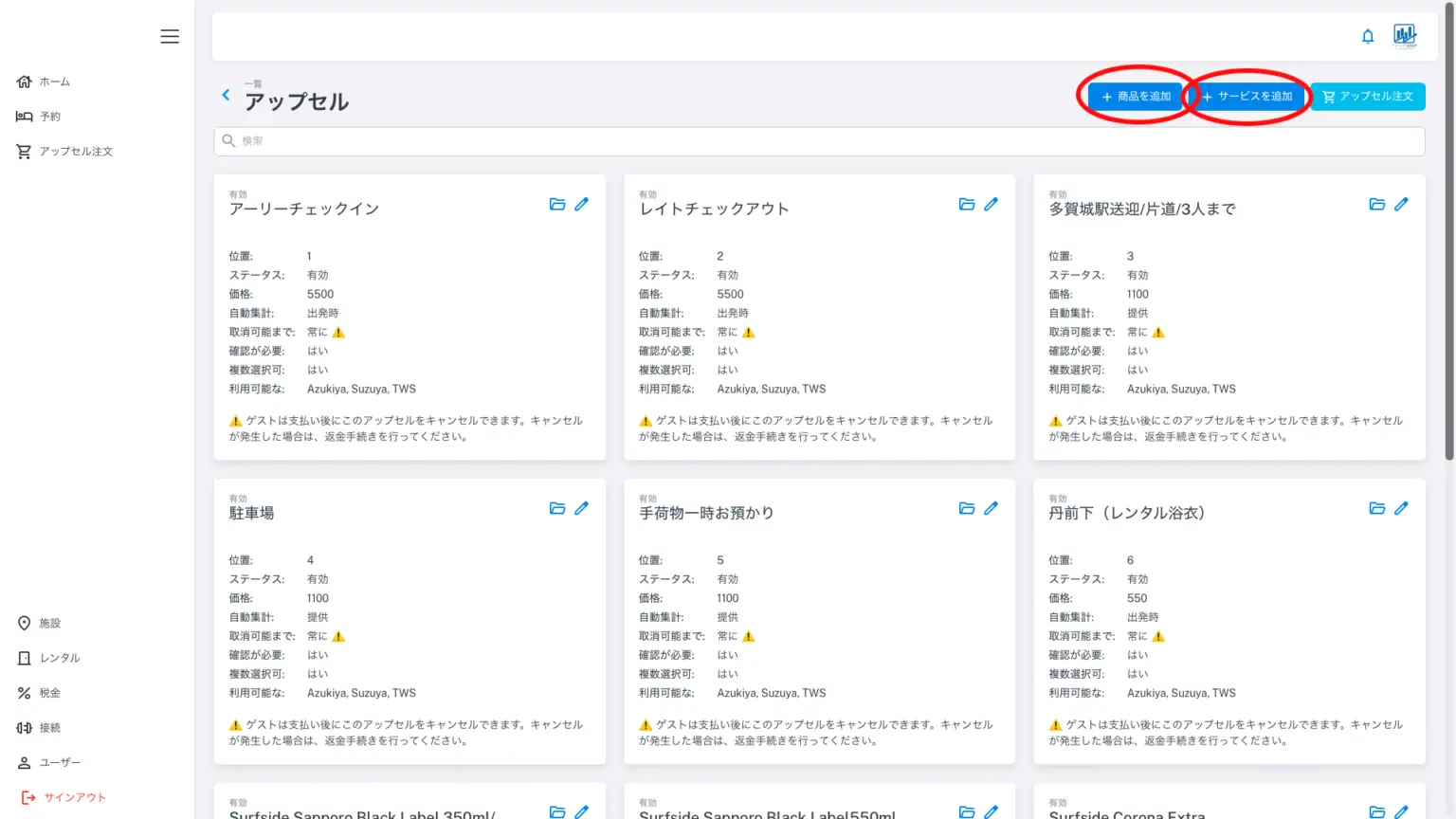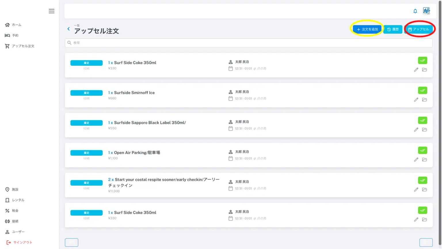 この画面は注文を却下したり、承認したりと、注文を管理する画面ですので、画面右上の赤丸印のアップセルを押してください。下記の「アップセル」(追加商品)を表示します。後ほど説明しますが、黄色の注文を追加を押すと、商品、宿泊者等を選択してオーダーを追加することができます。