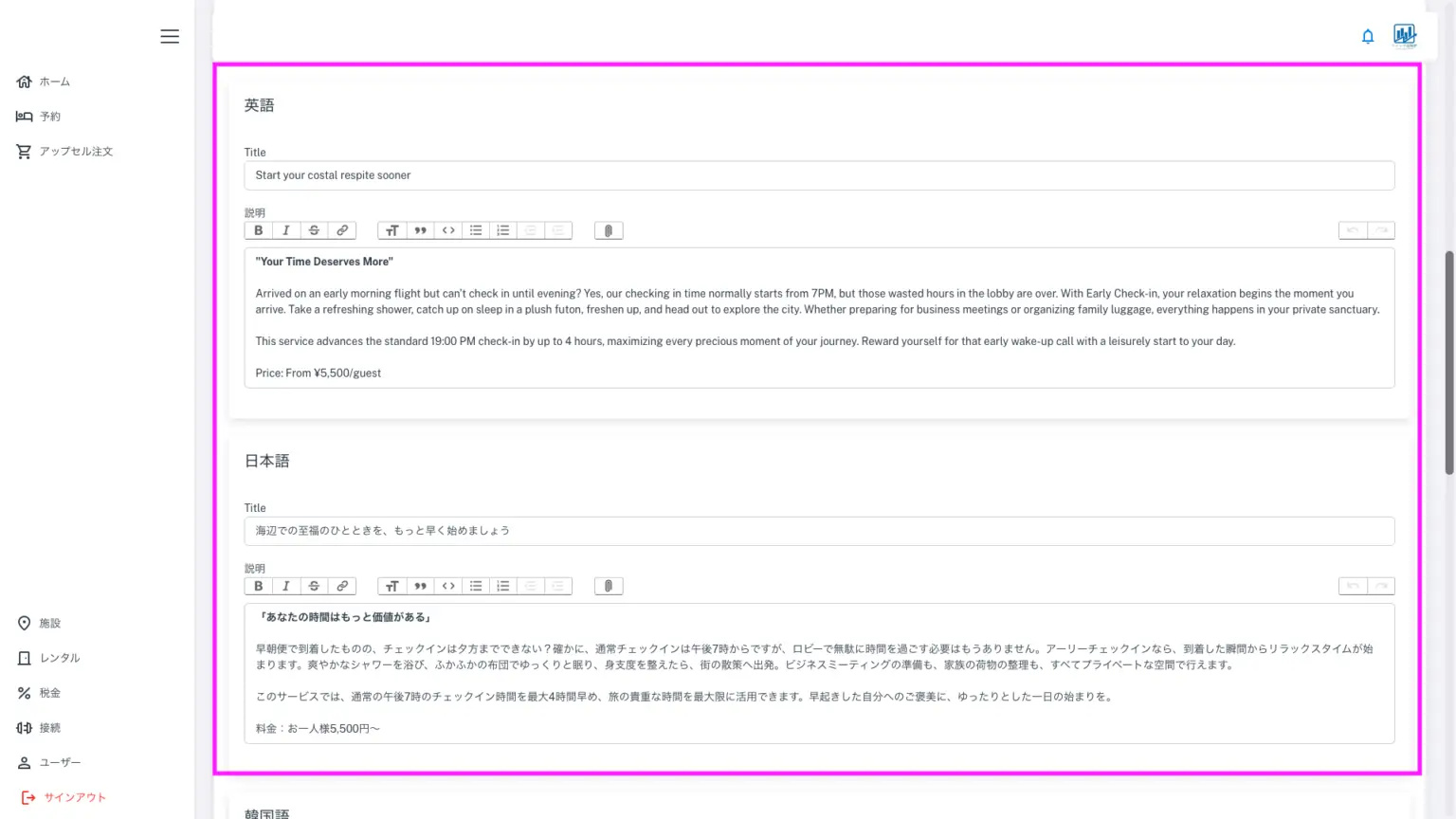 例えばこれはアーリーチェックインの日本語と英語の登録内容です。はじめに日本語でタイトルと、商品説明をしっかりと記載してください。それをgoogle翻訳で英語に直しましょう。次にその英語を元にして、goole翻訳で残り18言語を翻訳し、ページの最下部で保存を押してください。商品の登録が完了しました。