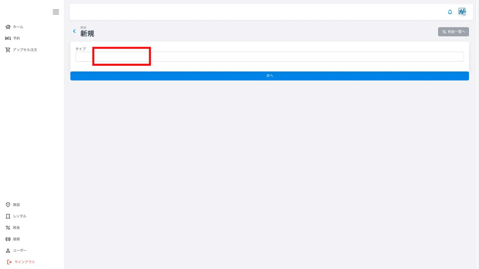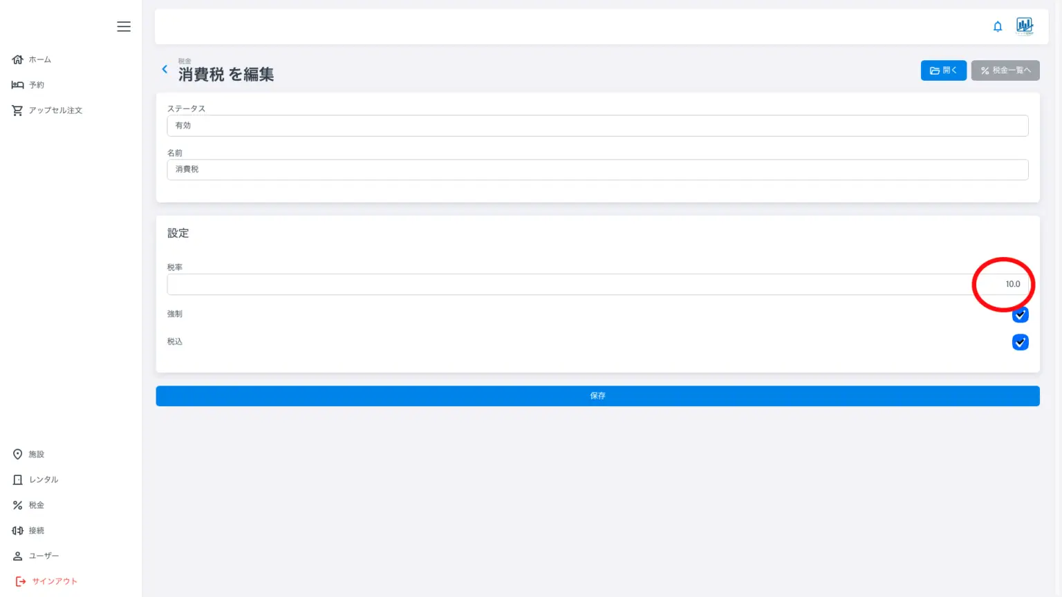 メニュー左の赤丸印「税金」を押すと上記画面になります。上記画面ではすでに宿泊税(宮城県)、消費税、消費税免税、消費税(軽減税率)が設定されています。