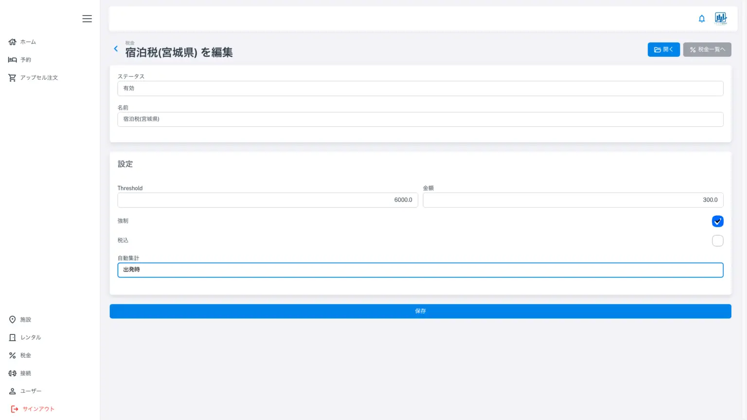上記は宿泊税の編集画面です。Threholdというのは、日本語では「閾値」です。複数段階の閾値を持つ制度もありますが、宮城県の場合は1段階です。アプリではこの閾値も追加できる設計です。宿泊税の場合、税込のチェックが外れていることを確認してください。(税抜6000円以上に対して300円の場合)