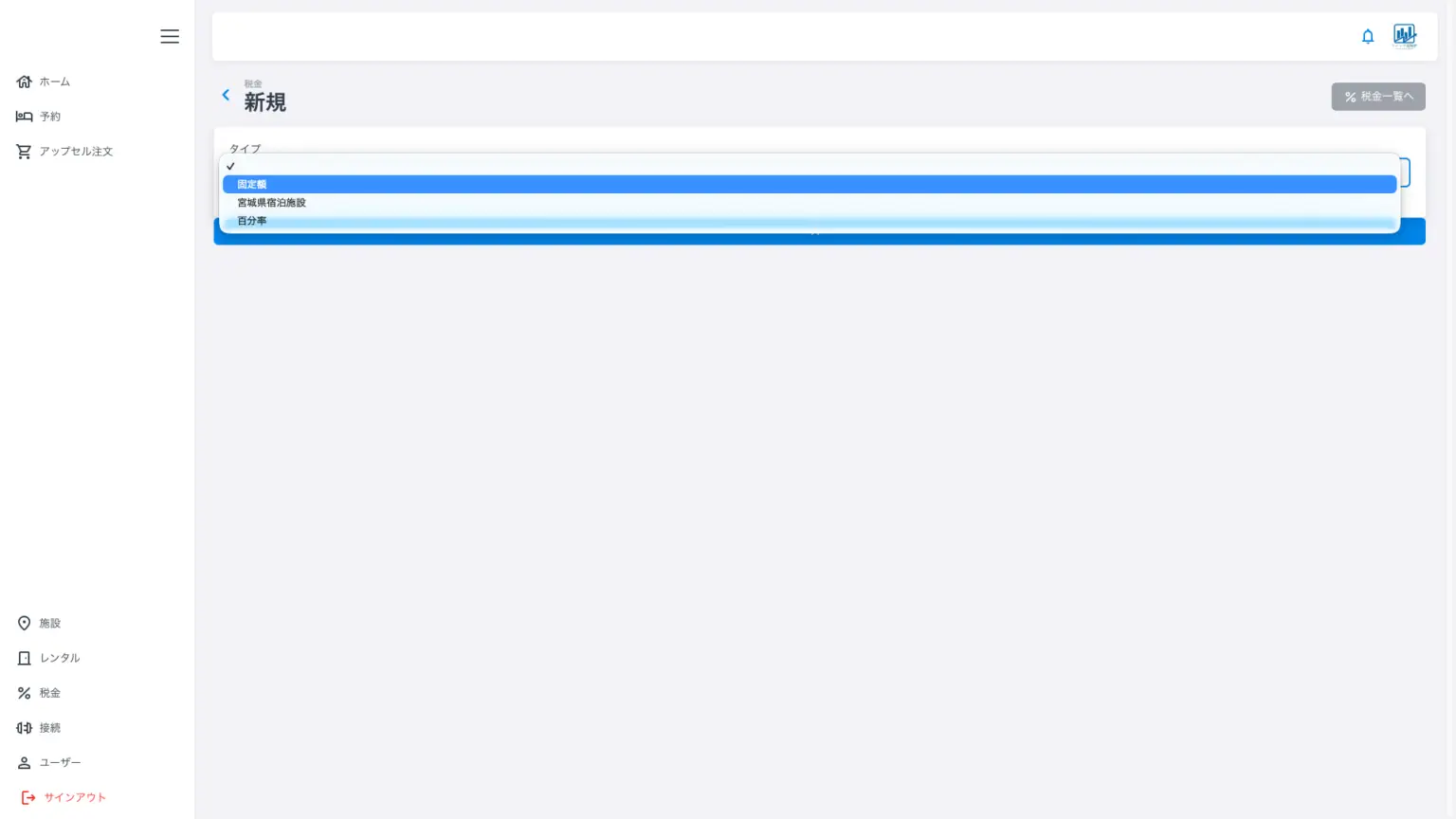 上記は少し古いバージョンですので、上から固定額、百分率、宮城県宿泊施設のみが表示されています。消費税のような率の税金は百分率を、入湯税のように固定額の場合は固定額を選択して作成してください。宿泊税に関しては、同じ制度を使っている都道府県もありますが、その地域で特別に設計されものも多くあります。プルダウンの選択肢は製品版は表示が増えます。プルダウンから選択し、その内容をさらに編集できるようにアプリでは設計されています。将来的な消費税や軽減税率の税制改正(国管轄)、宿泊税の税制改正(自治体管轄)にも、対応いたします。