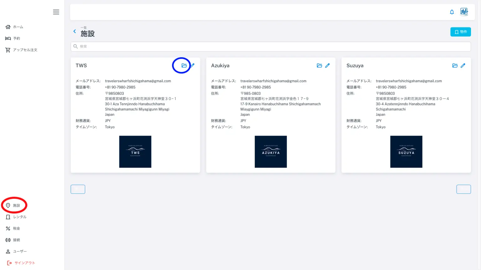 左側メニューの赤丸印「施設」を押してください。Beds24に登録されている施設を表示します。Stripeに接続したい宿泊施設の右上の青丸印「フォルダ」アイコンを押してください。下記の画面になります。