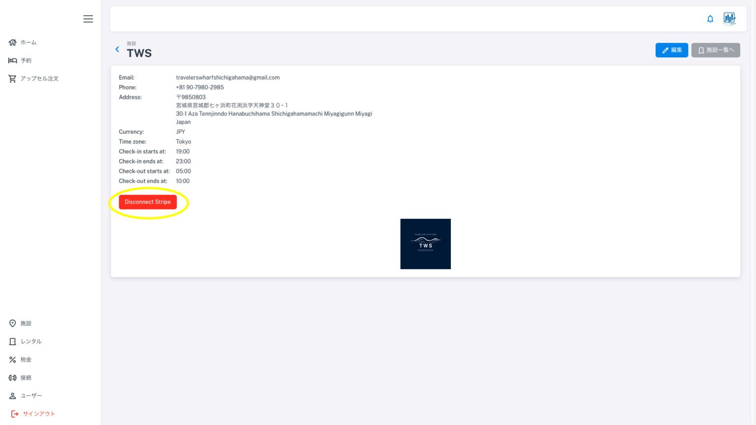 現在はすでに各施設がStripeに接続している状態になりますので、Disconnect Stripe(Stripeと切断する)が表示されています。Stripeにまだ接続されていない場合はConnect Srtripeと表示され、押すとStripeのログイン画面になります。接続したいStripeアカウントを選択すると接続が完了します。
