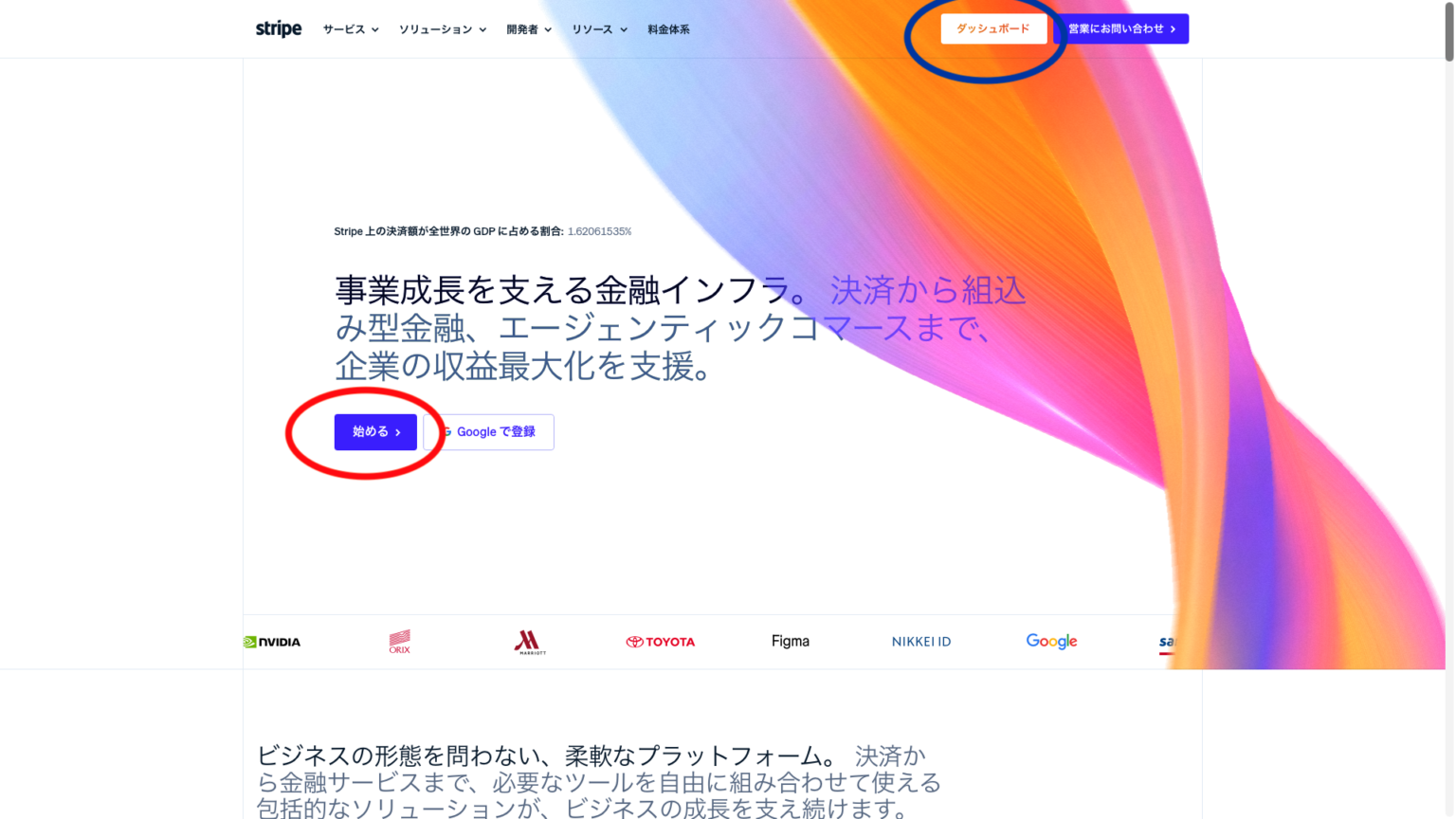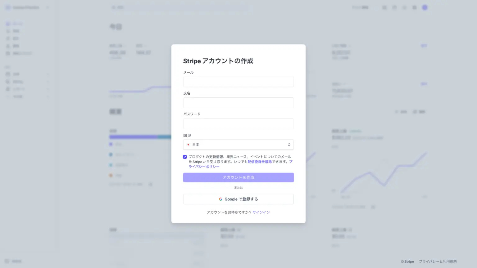の世界でもありません。ストライプのURLはこちら。上記画面の赤印、「始める」ボタンを押すと、以下の画面になります。
